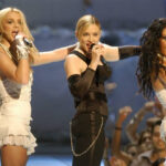 Madonna created similar controversy during the 2003 MTV VMAs when Britney Spears and Christina Aguilera joined her onstage during a medley performance, dressed as brides in tribute to her 1984 performance. At the end of the segment, Madonna leaned in to kiss both Spears and Aguilera before leaving the stage.
