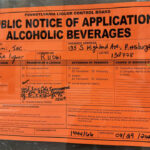 There is a Pennsylvania Liquor Control Board Public Notice of Application for alcoholic beverages posted on the right side of the building’s window in the form of an orange sign.