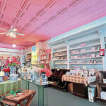 The bright pink tin ceiling is hard to miss and the complimentary mini-chocolate chip cookies available to shoppers are a must-try.