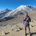 The three windswept summits of Burroughs rose progressively on the exposed tundra path. While unmaintained, the trail from second Burroughs to third was easily tracked. A surprise came after descending the second peak to a saddle and having the third summit block all sight of Rainier. From the saddle back up, though, each step revealed more of “The Mountain.” We finally reached the top and an in-your-face view of Winthrop Glacier, plus steaming volcanic vents high on the peak. We celebrated our “hike of ice and fire” with a well-earned rest and snack!