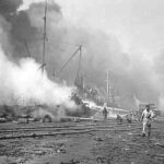 Strafing and incendiary bombs caused massive detonations on ammunition ships. Gasoline gushing from a ruptured pipeline and storage facility ignited and engulfed other ships in flames.