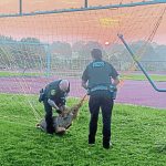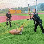 Lt. Donald Cole and Officers Adam Gogets and Frank Tempo freed the deer after it became stuck in a goal net on a soccer field at Greensburg Salem High School early Thursday.