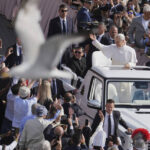 A bird flies by as Pope Leo XIV, on his popemobile, tours St. Peter’s Square at the Vatican on Sunday, prior to the inaugural Mass of his pontificate.