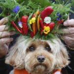 Chilli the dog wears has a chilli hat placed on his head in the BBC Radio 2 Dog Garden at the RHS Chelsea Flower Show in London, Monday.