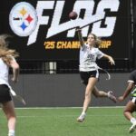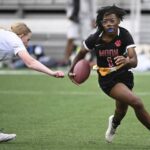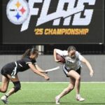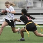 Moon’s Lilian Snyder tackles Upper St. Clair’s Ellie Shanholtzer during the Girls Flag Championship Sunday at Highmark Stadium.