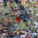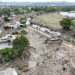 A drone view shows fallen trees, debris and damaged houses amid muddy floodwater after a river overflowed following torrential rains, in Poza Rica, Mexico, on Wednesday.