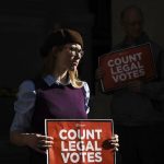 A protester holds a sign that reads “Count Legal Votes” during a “Stop the Steal” rally organized by supporters of President Trump outside the City-County Building on Friday, Nov. 6, 2020.