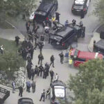 Aerial scenes showed several emergency vehicles on the scene and armed officers milling about at the entrance of a parking garage. Law enforcement vehicles were also lined up at the entrance to campus.