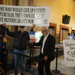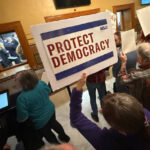Outside the state Senate chamber, redistricting opponents chanted “Vote no!” and “Fair maps!” while holding signs with slogans like “Losers cheat.”