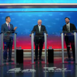 The underdog found himself caught in the middle — literally and figuratively — with the Republican’s lectern positioned between his two opponents as they lobbed attacks at one another.