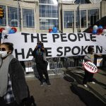 “Stop the steal!” the protesters chanted. Some carried signs that read, “Make Elections Fair Again” and “We Love Trump.” Police cordoned off streets leading to the building and maintained a close watch on the protest.