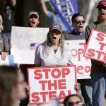 “Arrest the poll workers!” the crowd chanted, demanding four more years in office for Trump. Sheriff’s deputies kept protesters in a “free speech” zone away from the entrance to the building.