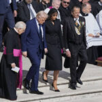 Trump stood out at the funeral service in a dark blue suit and a lighter blue tie in a sea of mournful black attire. The first lady, who is Catholic, wore a black dress and veil. Trump considers himself a “nondenominational Christian.” The couple paid respects to the late pope in front of his wooden coffin.
