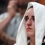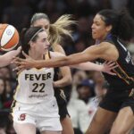Clark got hurt with under a minute left. She walked downcourt holding her right groin after assisting on the Fever’s final basket. As teammate Aliyah Boston tried to console her, Clark walked to the basket stanchion and banged her head against it before heading to the bench. During the timeout, she covered her head with a towel and appeared to be holding back tears.