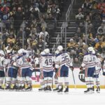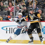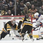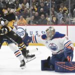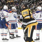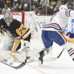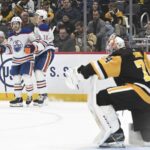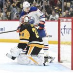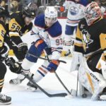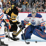 Accepting a pass in the left circle of the offensive zone, McDavid shuffled a feed across the slot that was partially blocked by kneeling Penguins defenseman Ryan Shea. The puck still managed to skid in on the crease and as Skinner flopped down in hopes of smothering it, Hyman backhand jabbed it in off of the goaltender’s right leg and into the cage. McDavid and Draisaitl had assists as the latter recorded his 1,000th point and was greeted by teammates rushing off the bench to celebrate.