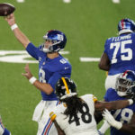 Jones had 279 yards passing and threw two touchdowns to Darius Slayton, but he was hurt by the pair of interceptions: one into the arms of T.J. Watt in the first half and a floater in the third quarter that Cameron Heyward pulled down in the end zone.