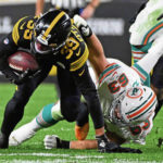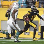 Minkah Fitzpatrick’s first interception of the game gave the Steelers the ball back at midfield with 1:13 left. After an offensive pass interference call on Johnson cost the Steelers a 34-yard gain to the 1, they faced a third-and-20 at the Dolphins 45.